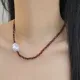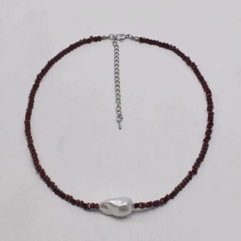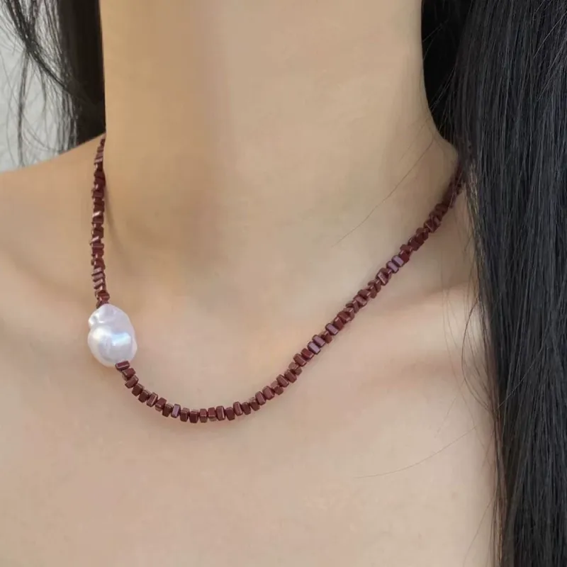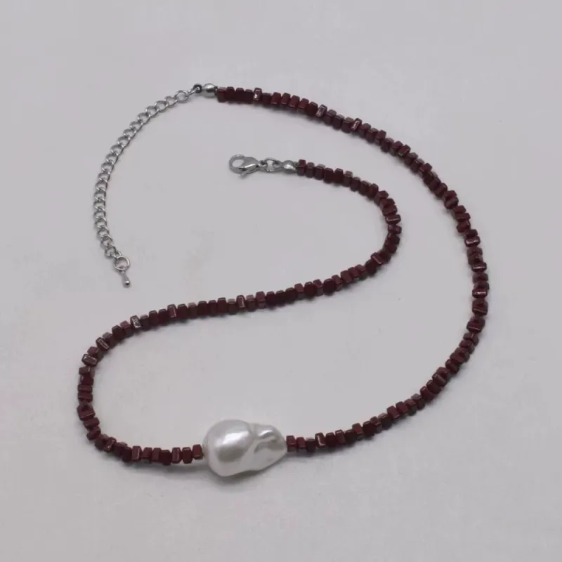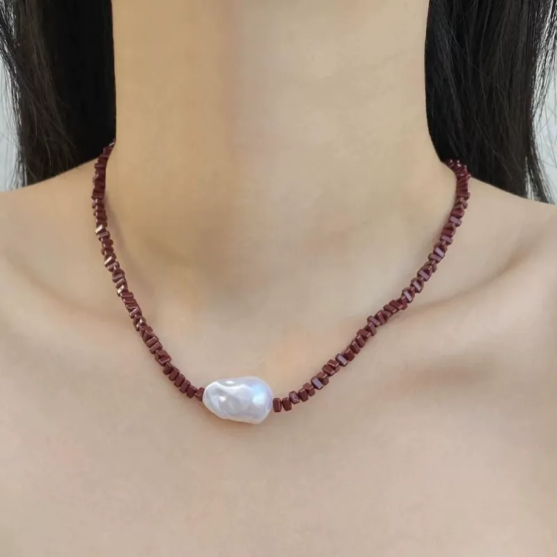 Crafted with high-quality, rich red natural stone square beads, this necklace features a striking, one-of-a-kind baroque pearl at its center. Each irregular pearl is unique, with a lustrous, iridescent sheen that catches the light beautifully, making every piece truly special.