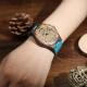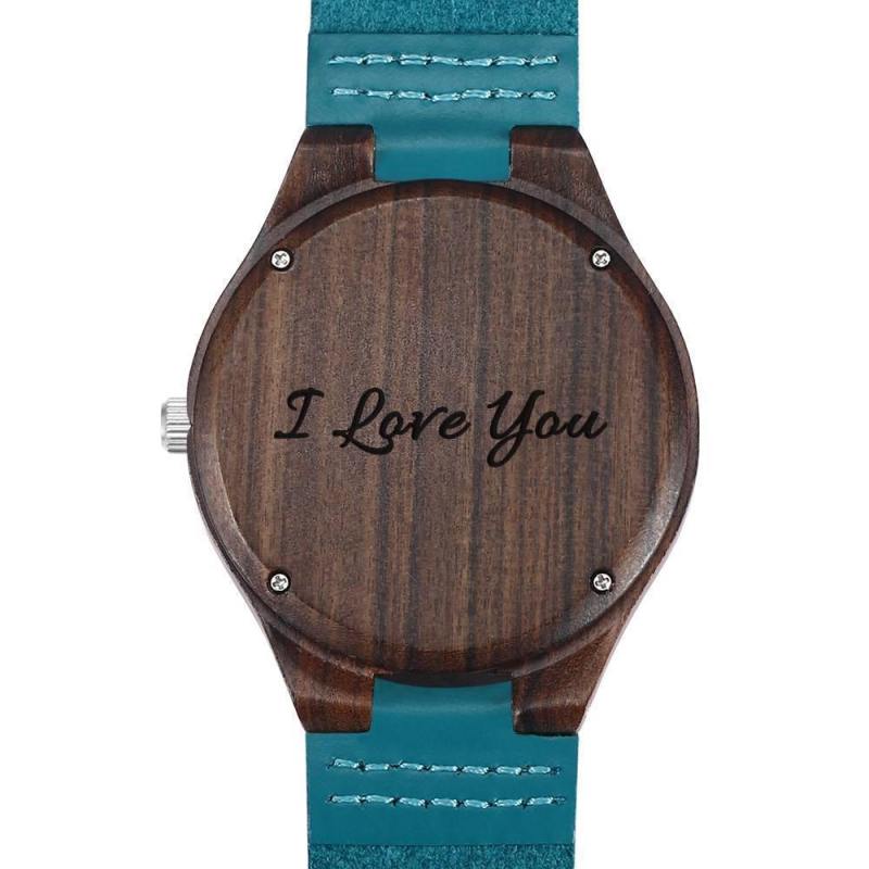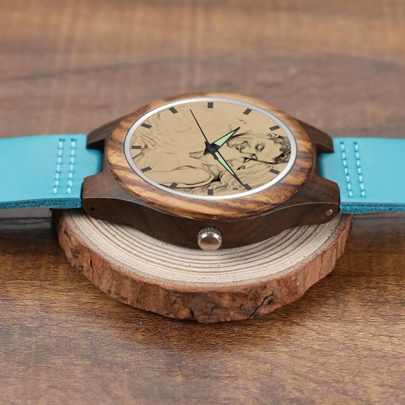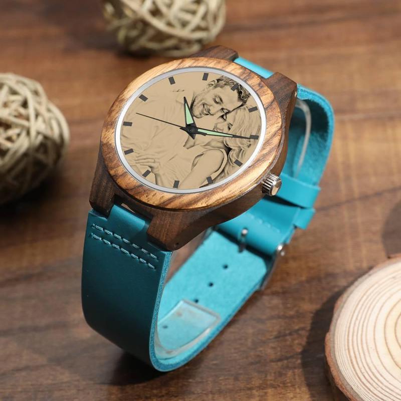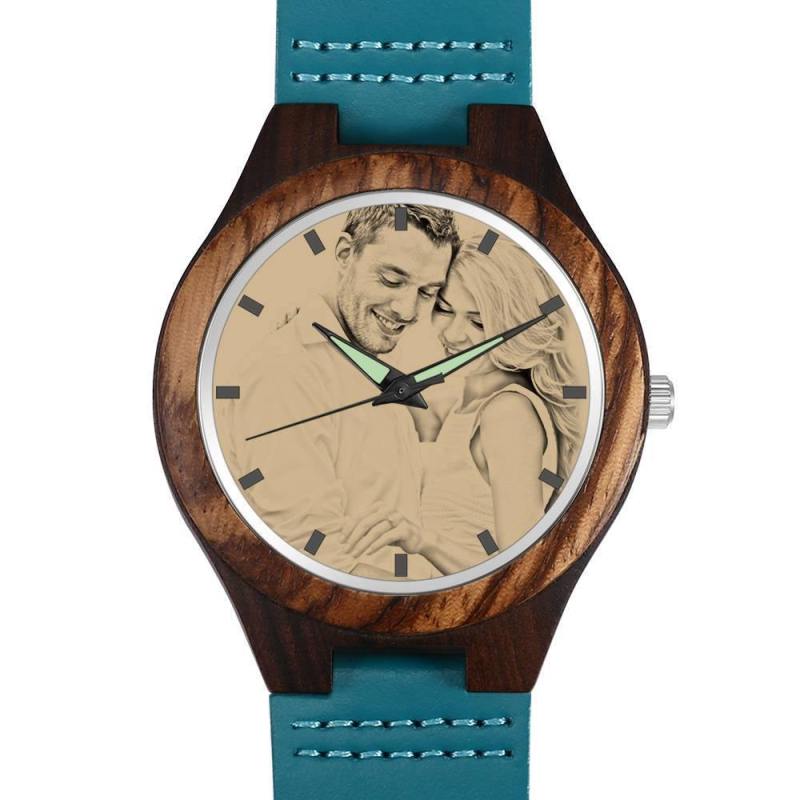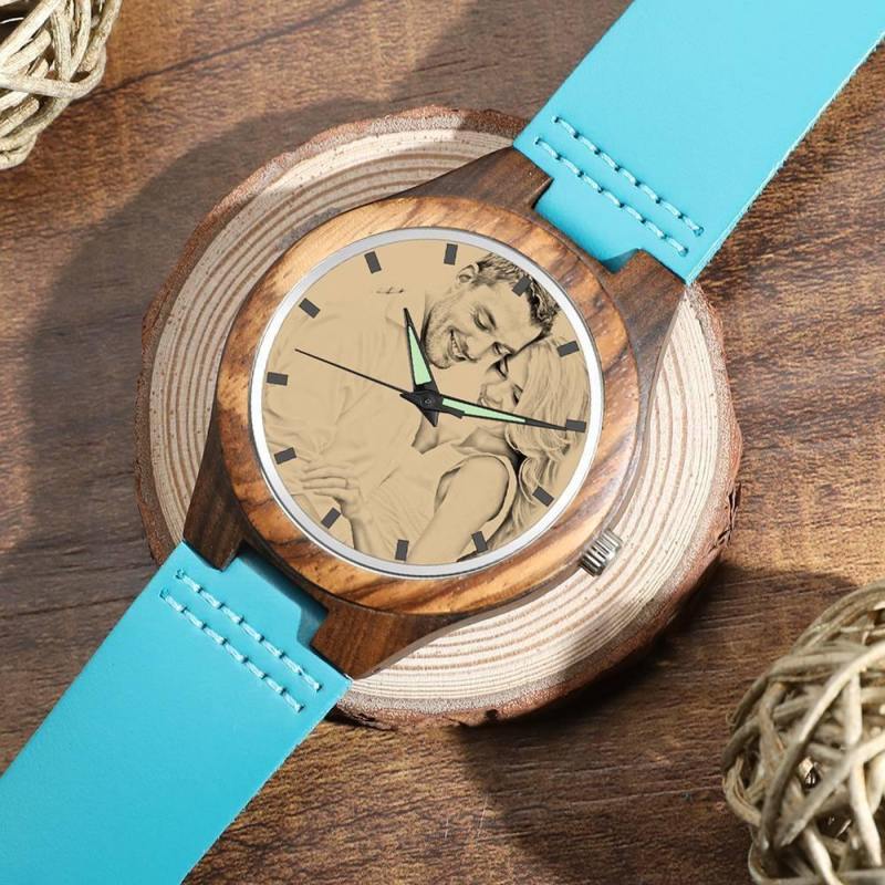 Women's Engraved Wooden Photo Watch Blue Leather Strap - Sandalwood
